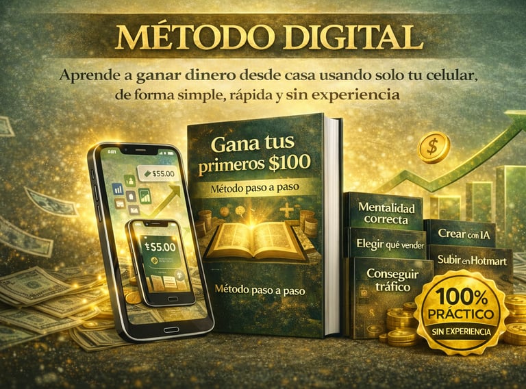 Es una guía práctica y directa que te enseña paso a paso cómo generar tus primeros ingresos online usando solo tu celular, incluso si empiezas desde cero.
